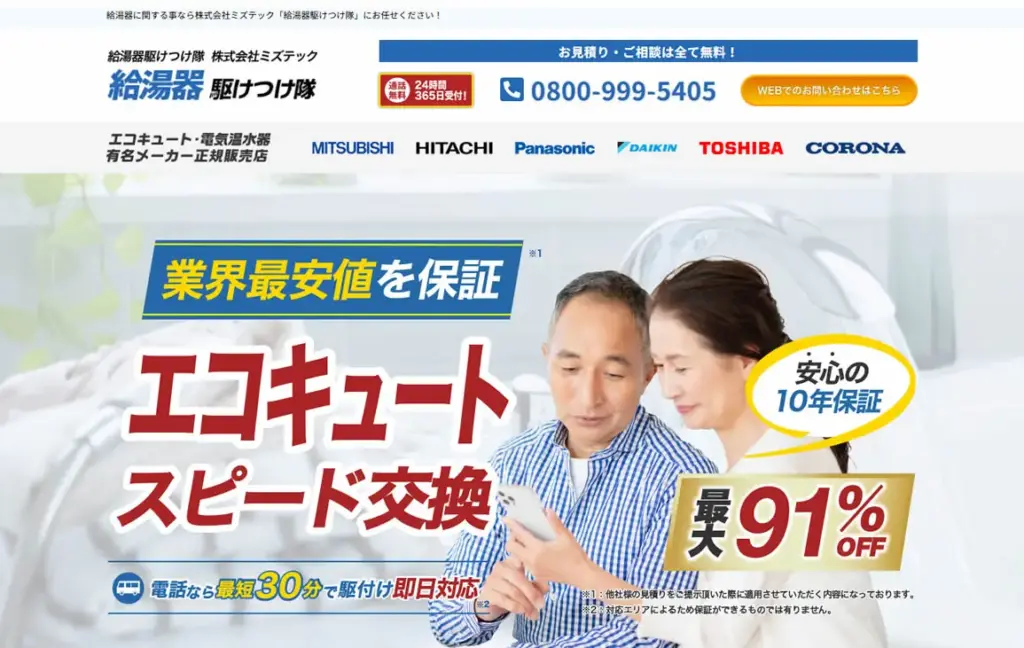 株式会社ミズテックが運営する「給湯器駆けつけ隊」は、給湯器やエコキュートの交換を専門とする業者です。