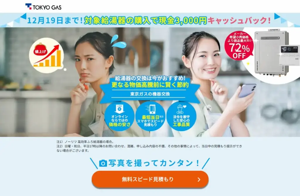 スマートフォンから簡単にお見積もりを依頼でき、最短当日に回答や訪問が可能です。急な給湯器の故障でお困りの際にもスピーディーに対応します。